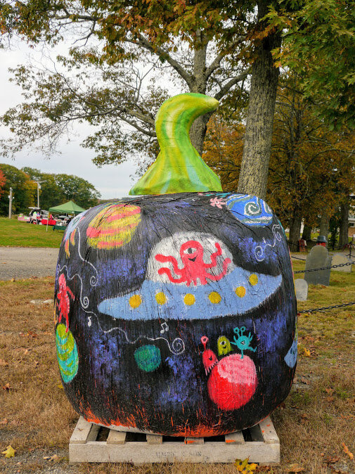 The Damariscotta Pumpkinfest is famous worldwide for displaying dozens of Giant Pumpkins on Main St in Damariscotta and Newcastle Maine, and around the area. Each year the pumpkins arrive on the Thursday afternoon before the festival - Pumpkin Deployment! - by flatbed and forklift. They are lovingly placed in position on stacked wooden pallets covered with burlap. The next morning, on Friday, a crew of volunteer Pumpkin Artists arrive at their assigned “pumpkin canvas” and spend all day transforming their pumpkin into a work of art. These photos below are just a few of the magical and whimsical designs over the years.